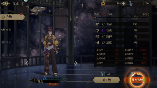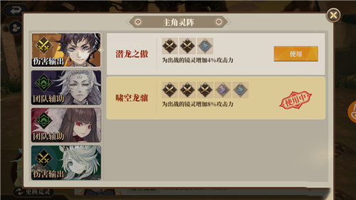 2、在游戏中主角一共有四名,其中有两名伤害输出和两名团队辅助,首先初始角色黄龙的技能是提升全队的攻击力,这个技能效果还是比较简单的,基本上能加成所有的阵容,非常适合新手玩家体验。