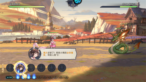 4、可以观察屏幕左下角的的魂力,小舞的魂力技能需要三点魂力,可以造成大量伤害,点击头像触发。