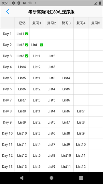答:每个Day的学习由`记忆`和`复习`两部分组成,Day2里有List2记忆和List1复习,两个都完成“打卡”,顶部的向右箭头就可以点击,切换到Day3。