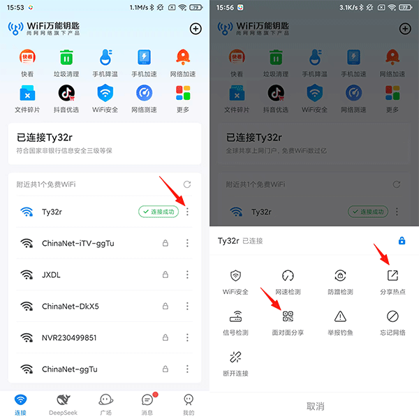 点击已连接的WiFi侧边的扩展按钮,在弹出的快捷菜单中选择“分享热点“或”面对面分享“。