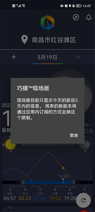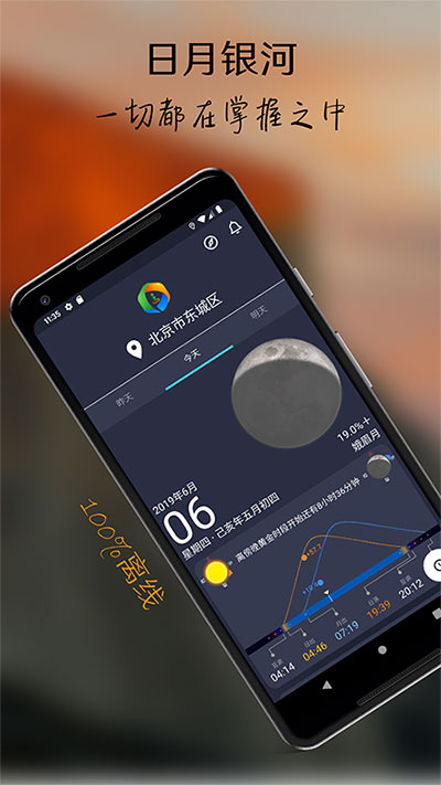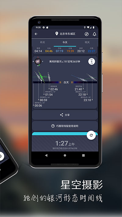 风光摄影师的追光之路其实就是抓住诸如太阳、月亮、银河星辰等等这些自然光所带来的光线的独特角度或者它们更好在某个位置的最佳瞬间。这些瞬间是非常短暂的,让摄影师在现场没有时间慢慢去操控手机,为此PlanIt Photo Inc公司又推出了巧摄现场版app,该软件操作界面十分简单,它只显示你的当前位置的昨天、今天和明天三天的信息,重要事件会通过三个卡片显示出来,第一个是月相日历卡片,第二个是日月卡片,第三个是银河卡片。而且现场版就两个操作:上下滑动看该天的三张卡片,左右滑动看昨天、今天和明天的情况。这个功能让你大部分情况下可能都不需要按任何一个按钮就可以看到需要的数据,甚至有智能手表的用户都不需要打开手机。