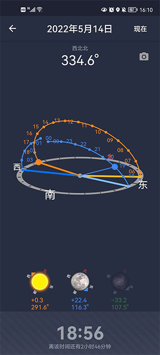 另外需要指出的是,该功能依赖于手机的方向传感器,而方向传感器有时候会受到周围环境磁场的干扰而不准确,安卓手机和苹果手机都有这个问题。因此,当你发现它指的不准的时候,不用奇怪。这个功能我一般只是作为一个参考。有时候拿着手机在空中划8字可以让传感器更准确些,但是不是绝对保证的。不过没有关系,只要现场可以看到太阳、月亮、或者星星,就可以判断出来手机指南针是否准确。如果不准,你就转8字,直到它准确,然后它指的未来时间的日月银河方向就会是准确的。