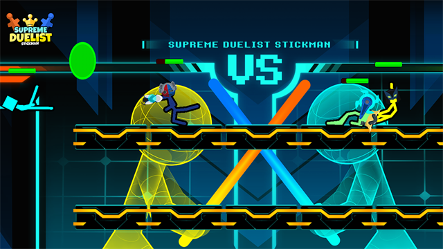 至尊决斗者火柴人是一款超级好玩的火柴人双人对战游戏,操作简单到只需要一根手指就能控制火柴人移动、技能的释放和攻击!更有意思的是游戏采用的真实物理引擎,配合决斗竞技场中的搞笑场景,两个火柴人左飘右飘,互相打斗在一起的样子真是太好笑了!完整版的至尊决斗者火柴人还新增了许多新武器(刀、药水、竖琴、棒棒糖、弓箭、灯笼、剑)等等,还有新火柴人角色:卡牌火柴人!这位卡牌英雄可以使用绿色、紫色、红色三种卡牌技能,触发各种爆炸效果!绿色卡牌束缚对手的武器,紫色卡牌互换两人的位置,红色卡牌更是决定对局胜负的大爆炸范围伤害!不过因为至尊决斗者火柴人的技能机制,我们是不能自由控制技能释放的,只能随机切换卡牌,然后在控制角色走位的同时将卡牌甩出去!这套操作可以说即简单又有趣,极大丰富了火柴人决斗的对战玩法,你能操控自己的火柴人打到最后吗。