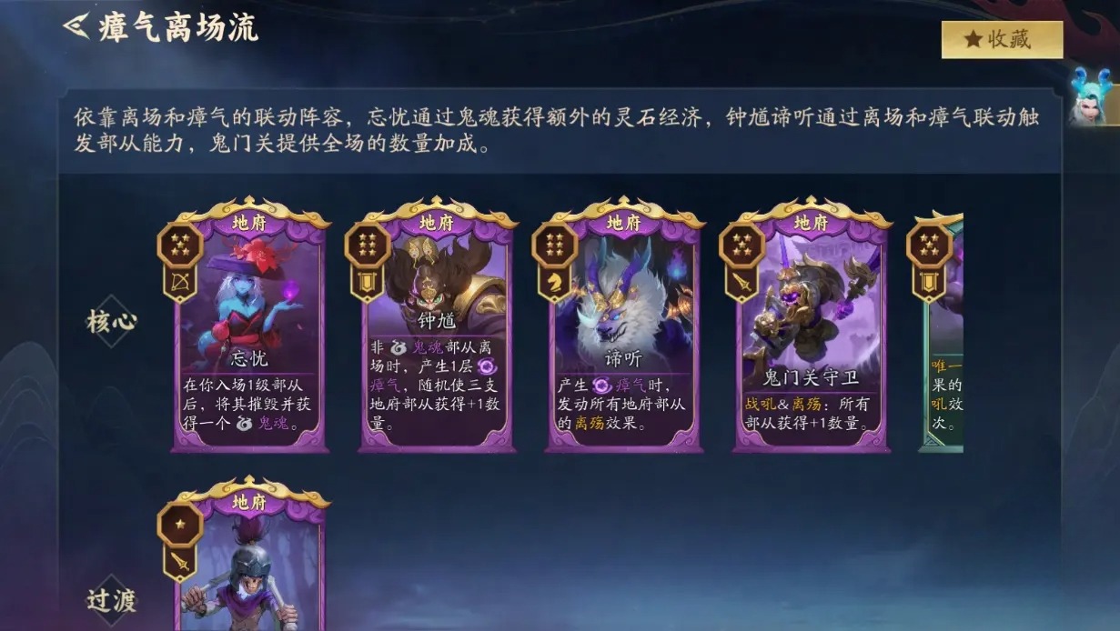 【地府】还衍生出多样的流派,如【瘴气离场流】就是一种依靠离场特性和瘴气叠加的联动玩法,依靠“忘忧”和“谛听”的部从效果,获得额外灵石资源的同时还能联动全场,增强数量进而提升战力。部从特性众多,不同部从之间的搭配有可能就诞生一种新的阵容流派。
