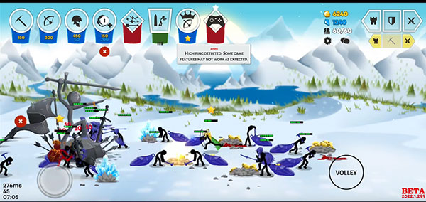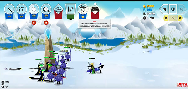 第十一关:冰冷山区,对方基本上是满级战斗单位,前期6矿工大力发展经济,先养四排剑士