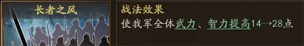 他的自带战法长者之风也能很好地补足前期队伍的属性。