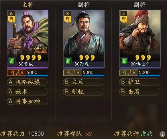 初入游戏我们只能两个武将上场,在没有更好的武将组合之前,建议用关平+丁奉,直接进行开荒。(关平大家一定有,丁奉则不一定,这时候我们可以随意用自己有的紫卡武将跟关平搭配,建议是,兵种适性尽量往高了组,优先使用兵刃输出的武将)