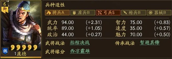 庞德的武将定位是爆发输出,由于适性比较限制在骑兵、弓兵,建议初始紫卡、橙卡以弓兵为主的玩家来搭配使用。