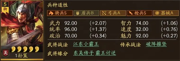 除了孙坚,孙策的入手门槛也不高,也可以跟孙坚组合在一起进行开荒。孙策比起关平,则拥有更好的属性、战法,也能跟孙坚组成,骑枪双A以上适性进行作战。